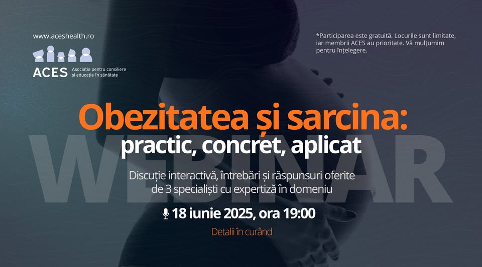 ACES- Asociația pentru consiliere și educație în sănătate organizează în data de 18 iunie 2025, de la ora 19, un webinar dedicat Obezității în sarcină.