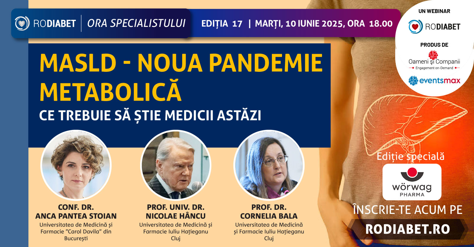 Marți, 10 iunie 2025, de la ora 18:00, platforma Rodiabet organizează un nou webinar din seria „Ora Specialistului”, cu tema: „MASLD – Nouă pandemie metabolică”.